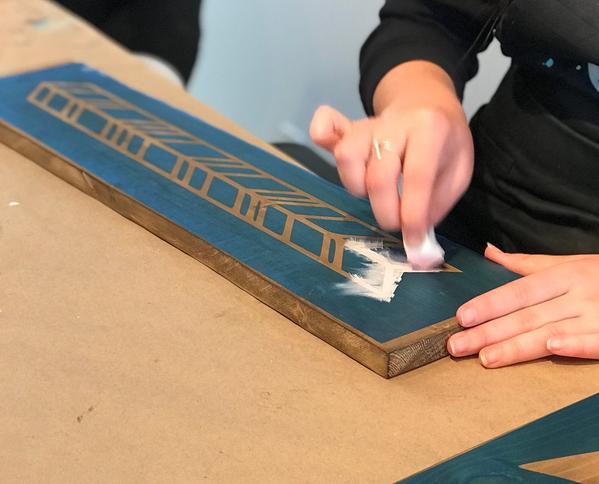 Both your wood and your personalized stencil will be placed on a work table at a reserved spot. If you requested to be seated next to a friend, you should find their design in the spot next to you. In order to protect your clothing, you will want to put on the apron provided. If you also wish to place your purse/handbag away from the work table, there is a designated area where you can safely place your things.