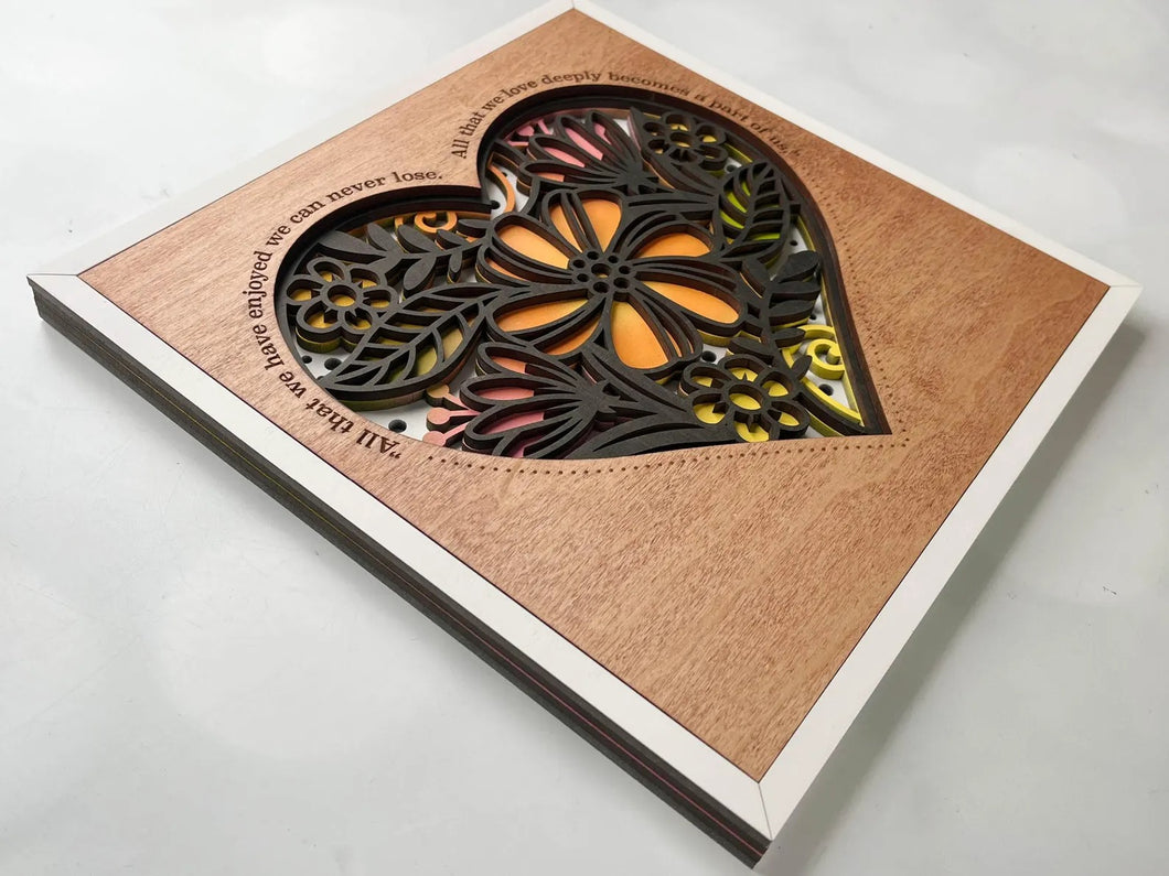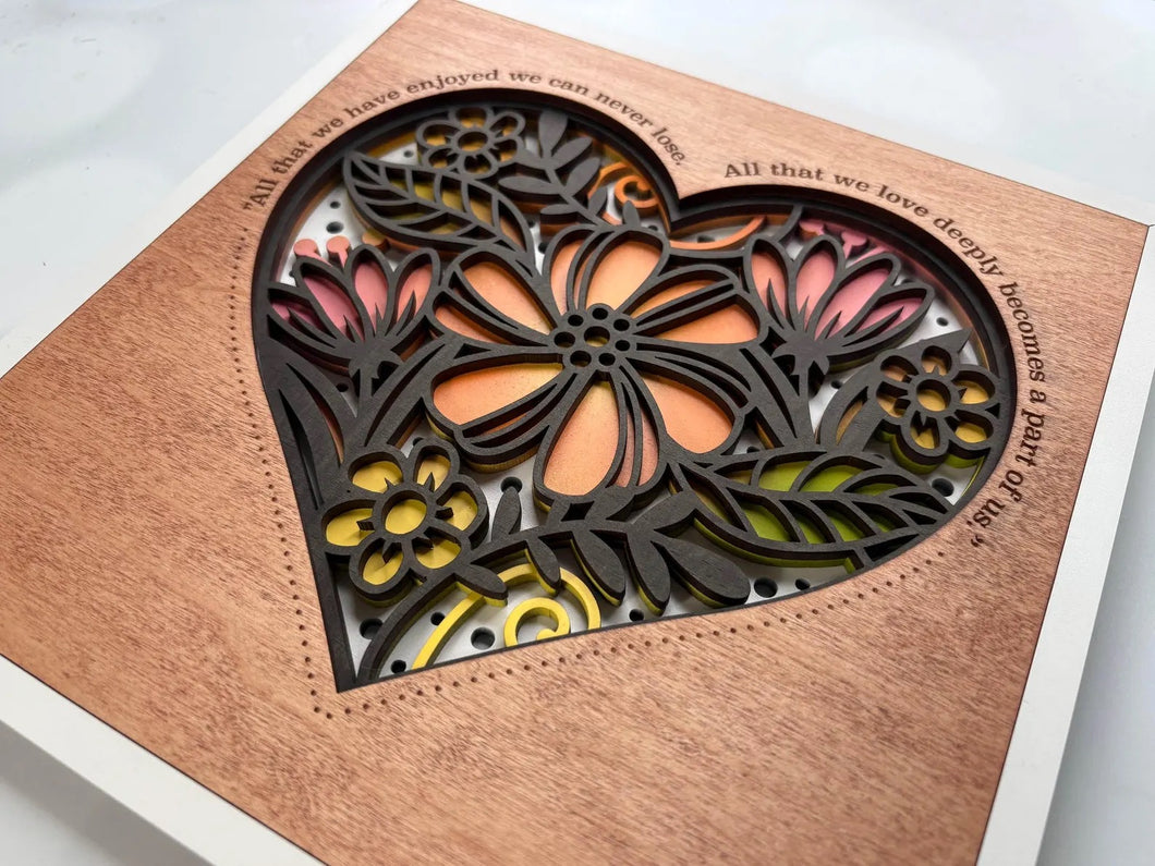 Participants will choose from a variety of stain and paint options to customize each layer, learning simple techniques for color placement and alignment to bring the design to life. The inspirational quote engraved around the heart adds a thoughtful finishing touch, making each piece truly special.