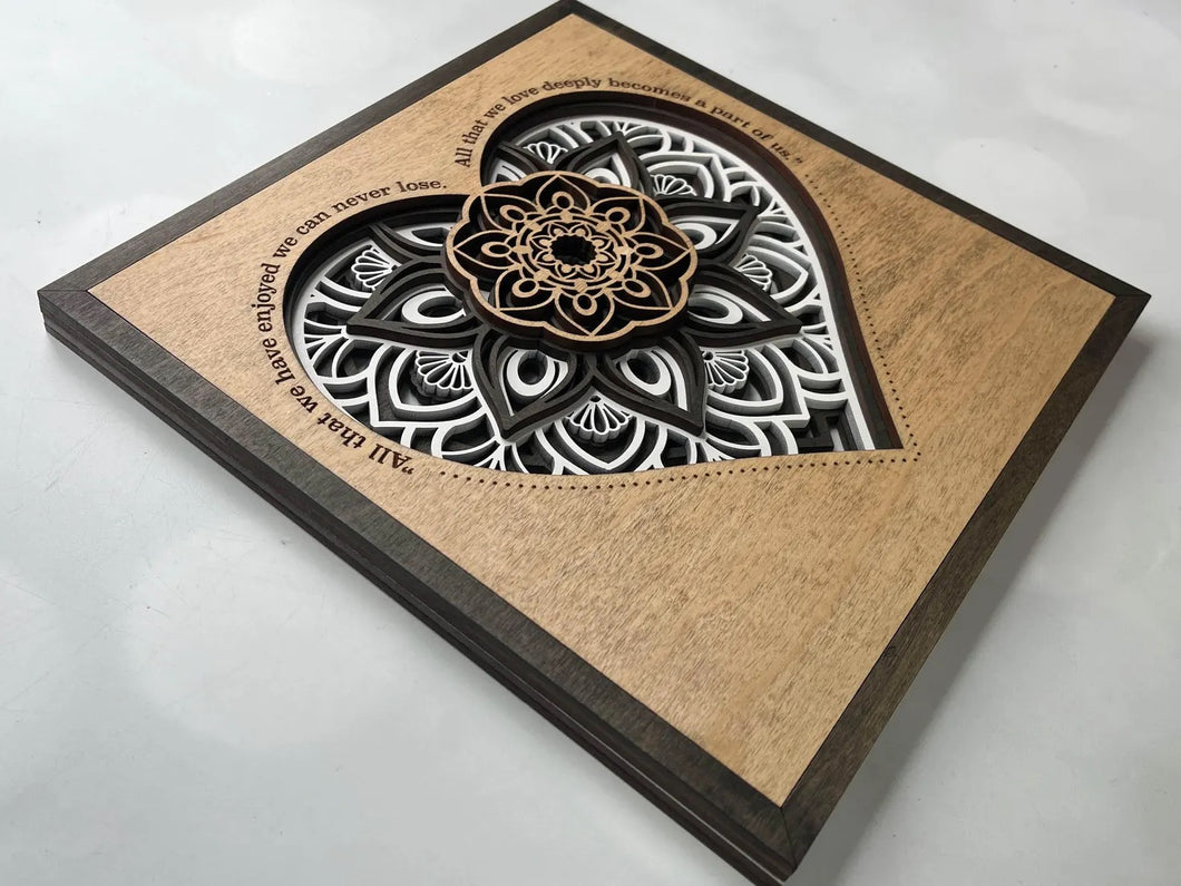 Create a stunning, dimensional keepsake in this relaxing and meaningful hands-on workshop. In this class, guests will assemble and finish a beautiful layered mandala heart design made from precision-cut wood pieces. With intricate details and multiple layers, this project creates depth, texture, and visual impact—perfect for home décor or a heartfelt gift.