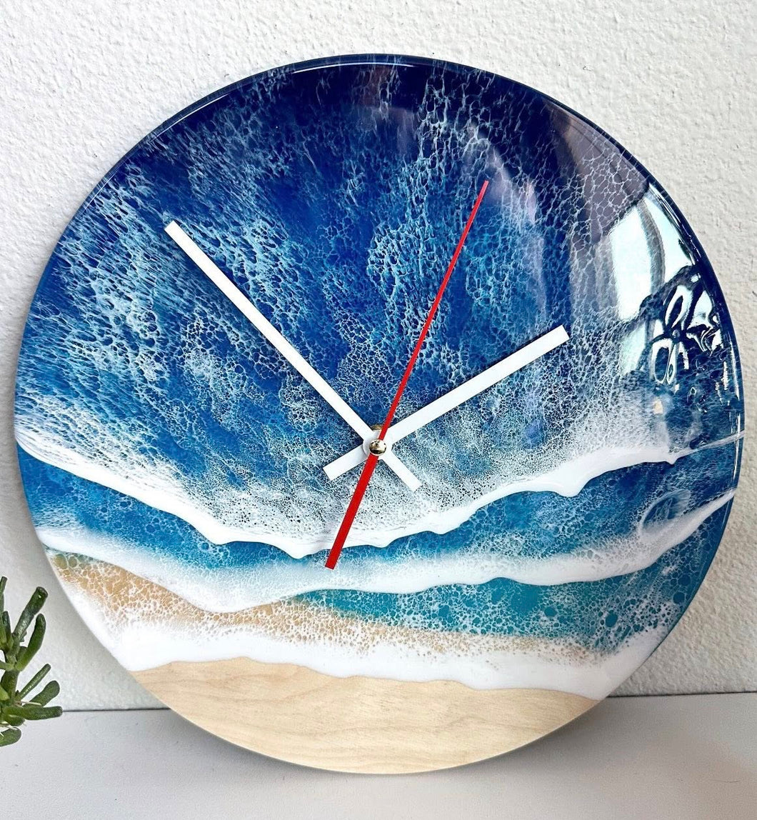 Create a stunning, functional work of art! You'll be able to select your colors and theme to color the resin at the workshop (pictures are examples of projects we've made in the past) ..then create your masterpiece during an instructor-led workshop! You do not need to do a beach theme, we will have several colors available! Clock measures approximately 18".