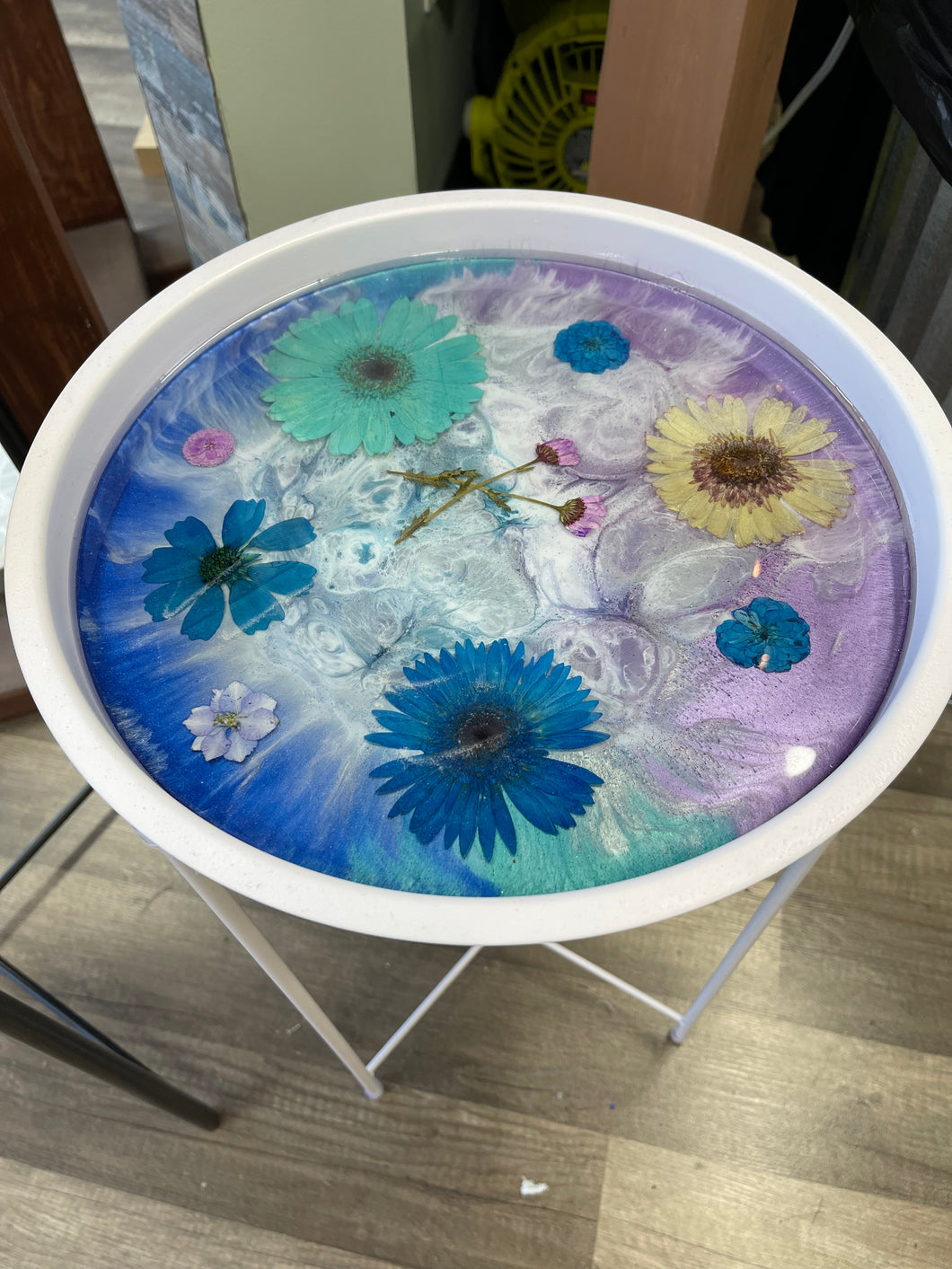 During the second workshop we will learn the art of preserving delicate pressed flowers in a stunning and functional metal tray table. You'll discover the techniques for arranging your botanical treasures and embedding them in crystal-clear resin. If you choose an acrylic overlay cutout, we will arrange and attach it during this session. Learn about resin safety and application while creating a personalized piece of functional art that reflects your unique style. You'll gain valuable skills in resin pouring, bubble removal, and finishing techniques, leaving you with a gorgeous, handcrafted tray table to enjoy. Create a unique piece that brings a touch of the outdoors into your home, perfect for serving drinks or displaying cherished items. All materials, including a metal tray and a selection of pressed flowers, are provided. Feel free to bring your own pressed flowers to make it even more special!